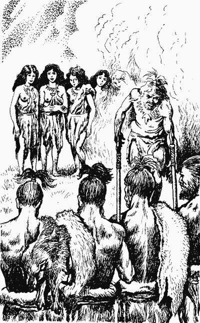 Праздник начался на другой день с рассветом. Женщины плотно завесили вход в пещеру и развели огонь. Своды пещеры наполнились дымом, пахучим и едким. В пещере было темно, и искры огня сверкали сквозь дымную завесу, как будто в сумраке ненастного вечера.