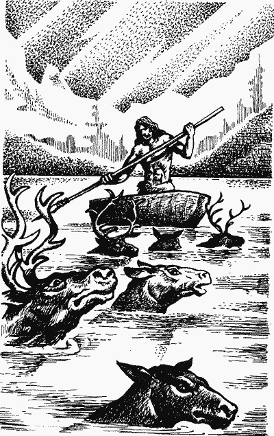 Олени каждую весну собирались стадами и спускались с гор на моховые пастбища у берегов океана. Они шли прямо, с юго-востока на северо-запад, и переплывали по дороге широкие реки. На реке Дадане у них были три битые тропы. Анаки сидели на средней тропе у Лысого Мыса. Они кололи оленей длинными копьями в волнах реки и в удачный год убивали тысячи.