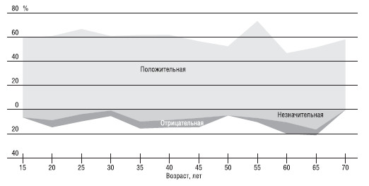 Наконец, обратимся к возрастной разбивке ответов о том, как люди «устраивают свою жизнь в переходное время» (ноябрь 1994 года). Наибольшая частота ответов типа «не могу приспособиться», а также «ничего не изменилось» приходится на старшие возрасты (после 65 лет). «Пик» успеха («удается использовать новые возможности, начать серьезное дело, добиться большего в жизни») – это 20–30 лет; высота «пика», правда, всего 12–13 % от численности группы. А у 40-летних – максимум варианта «приходится вертеться, подрабатывать, браться за любое дело, лишь бы обеспечить себе и детям терпимую жизнь». Так отвечают более 40 % в этой группе (при средней по населению доле 30 %).