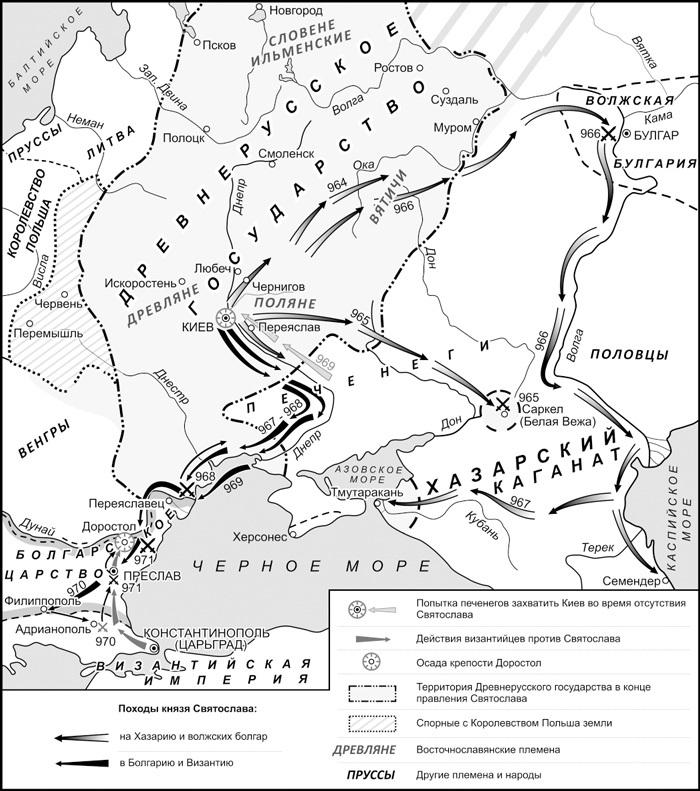 Первой мишенью Святослава стал Хазарский каганат на востоке. Конфликт с этой страной был неизбежен, так как оба государства претендовали на северное Причерноморье и торговлю с Востоком. Известно, что в ходе довольно короткой военной кампании 964–966 гг. русские войска полностью разбили хазар. Успех был обеспечен эффектом внезапности.