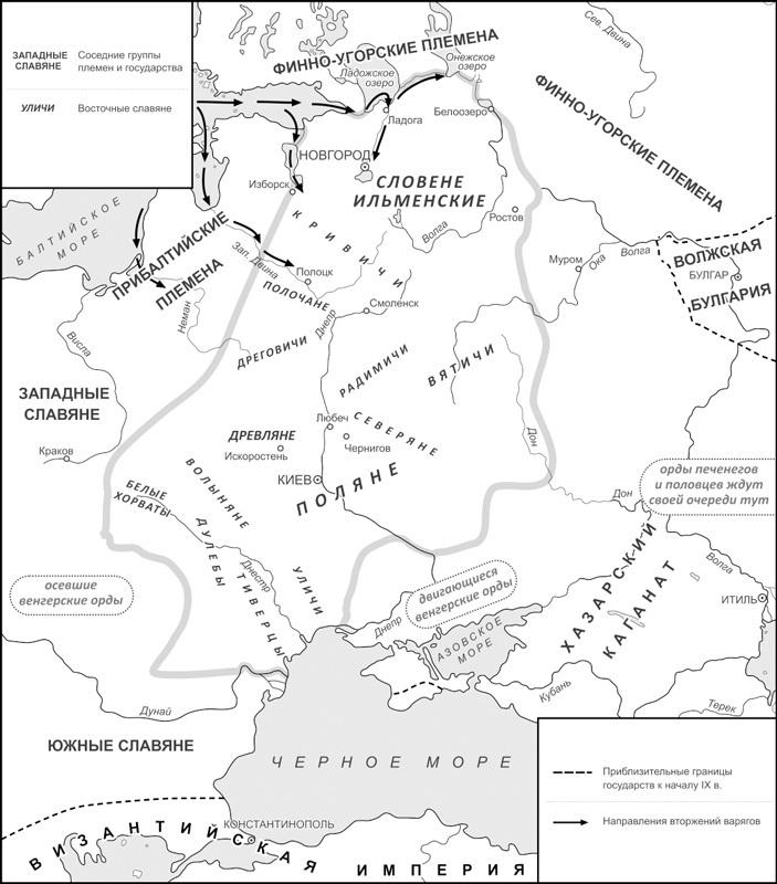 Сами того не подозревая, восточные славяне приняли, пожалуй, самое внесистемное решение – вместо того, чтобы, как все, устремиться на запад, они развернулись на восток. Двумя потоками они постепенно заселяли обширные территории от реки Днепр на юге до озера Ильмень на севере. По забавному стечению обстоятельств, ни одна из групп славян либо не заполучила полноценного выхода к морю, либо не смогла им грамотно воспользоваться.