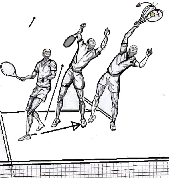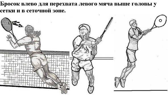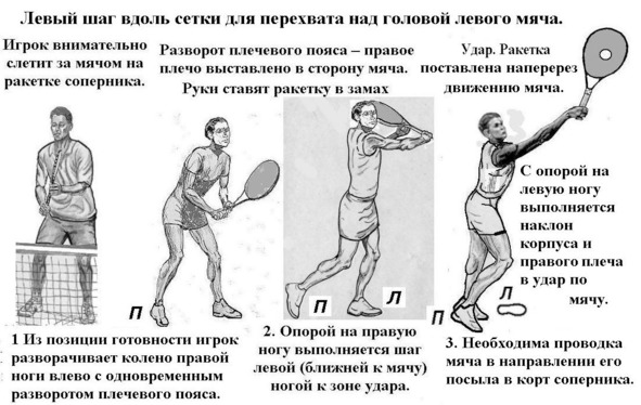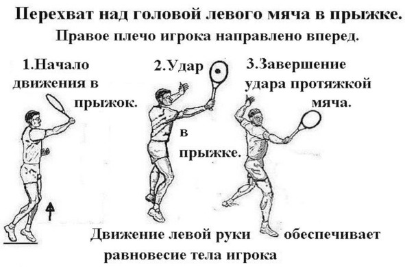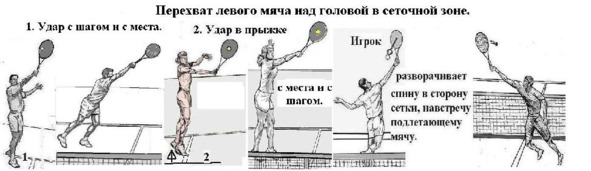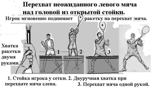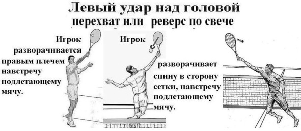 1. Удар «Реверс-перехват». Это удар над головой по левому мячу на высоте вытянутой вверх руки с ракеткой с места или в прыжке. Удары «реверс — перехват» выполняются:
