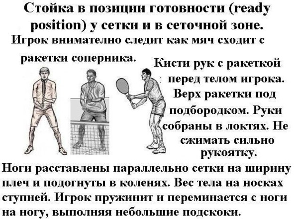 Игрок на корте должен быть готов к быстрому ответному действию и находится в позиции готовности «ready position» или в позиции ожидания, что одно и тоже.