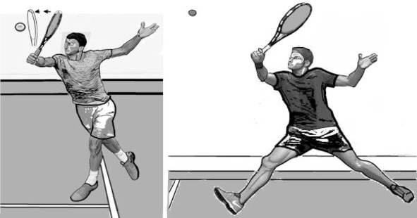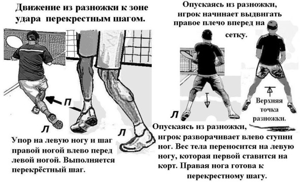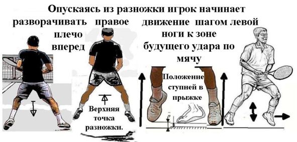 1. Для крайне необходимого быстрого старта из «ready position» теннисисты применяет прием «разножка», выталкивая себя ступнями ног на 3 — 5 см. вверх, в безопорное положение. Начинается «разножка» из «ready position» за долю секунды до звука удара ракетки соперника по мячу, то-есть за мгновение до контакта с мячом. Это сложно, но реально. За десятую долю секунды (0,1—0,2 сек.), пока игрок находится в безопорном положении «разножки», можно понять, куда соперник направляет мяч и как надо на это среагировать. «Разножка» позволяет игроку, в короткий момент безопорного положения, понять замысел соперник и принять решение на ответные действия. В какую сторону корта, надо или не надо двигаться и какой, удар необходимо или можно выполнить. Из «разножки» проще и удобней начать движение в любую сторону.