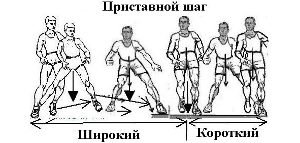 1. При перемещении вправо — первый шаг правой ногой вправо. Затем шаг левой ногой.