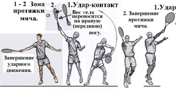 «Посадив мяч» на струны в момент контакта, игрок сразу начинает «движение протяжки» ракетки вслет за отлетевшим мячом. После контакта с мячом, не тормозите и не останавливайте инерцию движение руки с ракеткой и тела в направлении удара. Продолжайте расслабленное ударное движение в сторону отлета мяча. Должно возникнут ощущение, что струнная поверхность прошла «насквозь» мяча и затем инерционное и расслабленное движение руки и тела продолжается до естественного нерегулируемого затухания движения. Только в этом случае можно получить хороший и целенаправленный удар.
