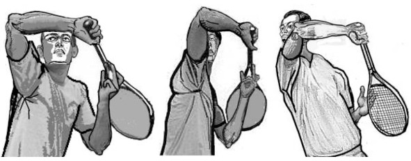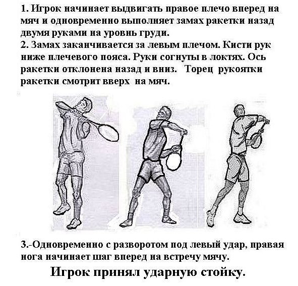 2. В момент замаха левая рука затягивает ракетку под левое плечо, плотно держа её за горловину. Струнная головка ракетки значительно ниже торца рукоятки. Правая рука расслаблено двигается вслед замаха, поддерживая ракетку за рукоятку. При этом правая рука ставит торец рукоятки ракетки вверх на мяч. Это обязательно.