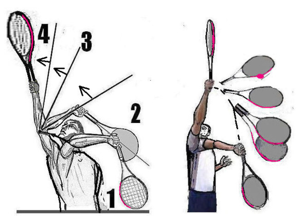 1. Из ударной стойки правая рука срывает ракетку с ладони левой руки в ударное круговое движение на мяч по радиусу снизу — вверх. Правая ударная рука распрямляется в локте. Ракетка активно двигается вверх по окружности радиусом правой руки с центром в плечевом суставе правого плеча.