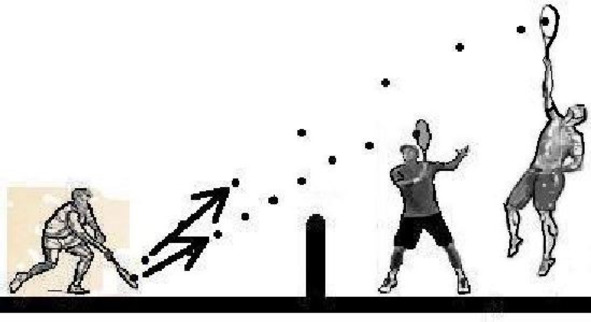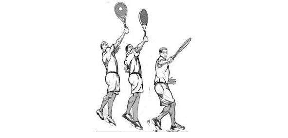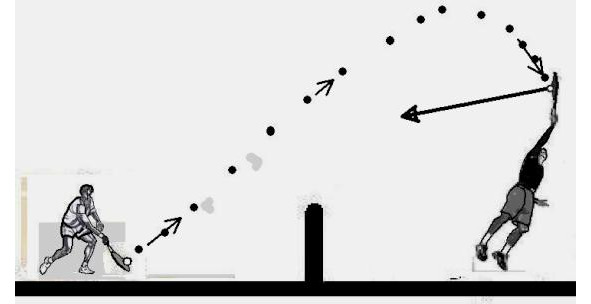 1. Если высота свечи больше 6 метров, то отскок мяча будет высоким. Тогда будет удобно выполнить удар над головой с отскока мяча. Наличие отскока увеличивает время для подготовки игрока к удару, пока мяч поднимается и вторично начинает опускаться вниз. В это время игрок подходит под падающий мяч, развернувшись лицом на мяч. В этом случае рационально выполнить удар смэш, так как он сильнее удара реверс и есть время для захода под левый мяч для правого удара по свече.