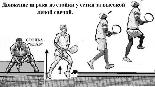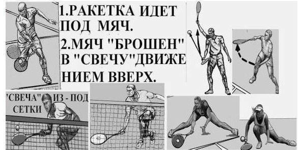 В обоих случаях удар по левому мячу наносится выше головы и технические действия игрока содержат схожие элементы, (рис. 2). Техничный соперник всегда бросает свечу через голову игрока за него, в открытую зону корта. Классическая свеча, это высоко брошенный мяч и затем упавший между серединой корта и его задней линией.