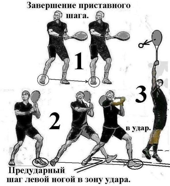 После входа в зону удара выполняется разворот плечевого пояса и тела влево, тоесть правым плечом вперед с одновременным заносом ракетки к левому плечу в предударную стойку.
