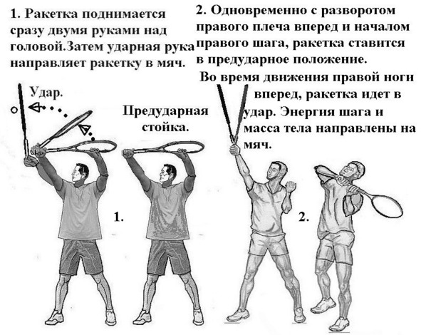 Игрок становится в предударную стойку, когда уже встал под мяч и мысленно нашел точку удара по падающему мячу. Скорость руки с ракеткой, от замаха до точки удара в мяч, зависит от скорости падения мяча. Удар выполняется на полностью распрямленную руку с ракеткой.