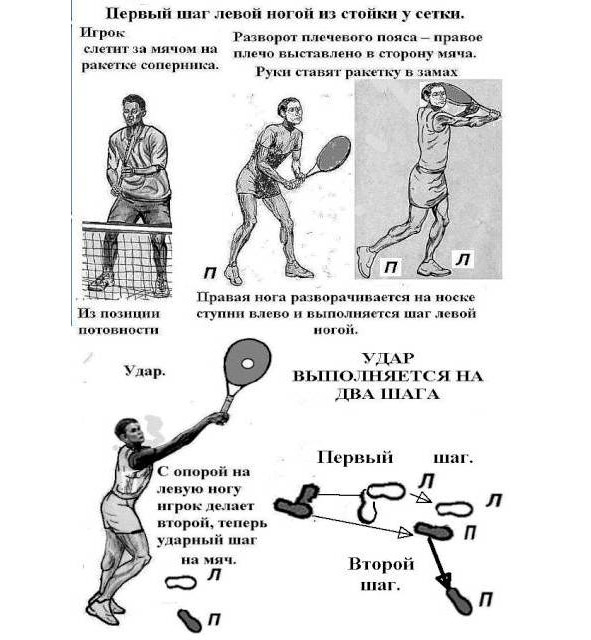 Правильная работа ног (footwork), это фундамент техники игры в теннис. Надо уметь быстро и легко двигаться в любом направлении и даже быстро пятится от сетки спиной назад. Скоростной бег не всегда решает проблему правильной работы ног. «…Около 70 процентов ошибок у теннисистов вызваны плохой работой ног..» (Джек Гроппель). В зависимости от игровой ситуации применяются обычные, приставные и перекрестные шаги,