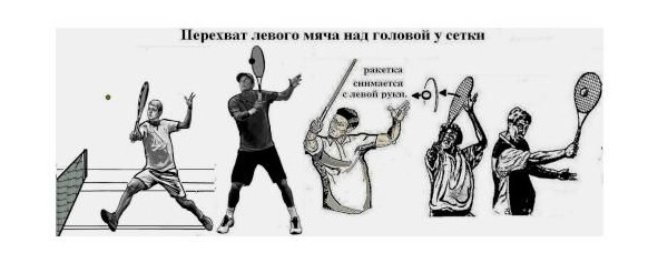 В этих случаях левый мяч перехватывается над головой у сетки и по всей сеточной зоне. Реже у линии подачи или в середине корта. Некоторые специалисты тенниса считают их левыми ударами с лета над головой.