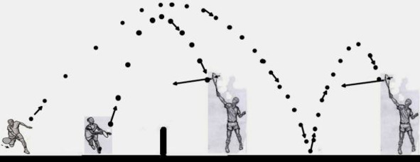 2. Выполнить удар над головой по круто падающему на игрока мячу из крутой и высокой свечи сложнее, чем при ударе по мячу над головой после его отскока от корта, когда и скорость падения мяча ниже. Бить по такому мячу удобней и проще. Но с другой стороны и соперник будет иметь дополнительный запас времени при отскоке мяча свечи от корта.