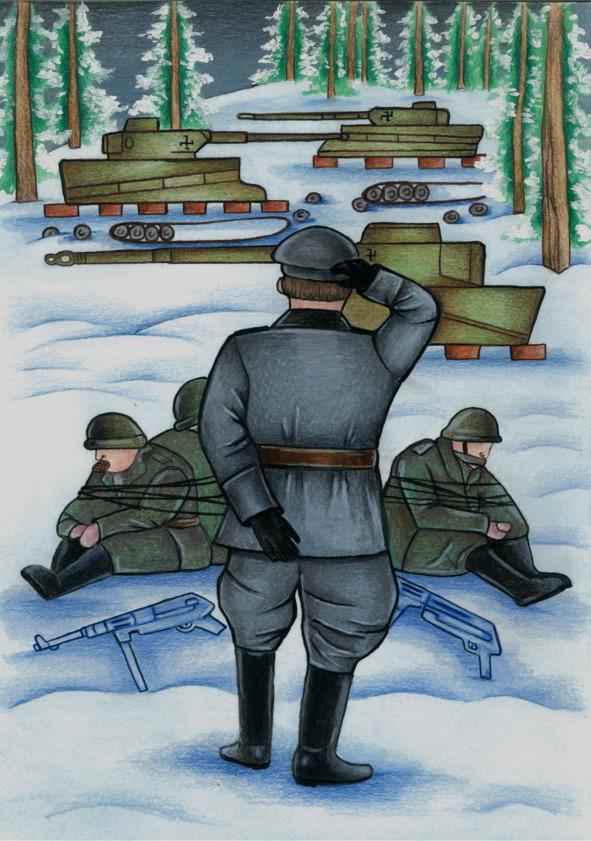 Разобравшись с часовыми, Снегуренок подошел к танкам, вытащил из-за пазухи кирпичи и положил их на снег.