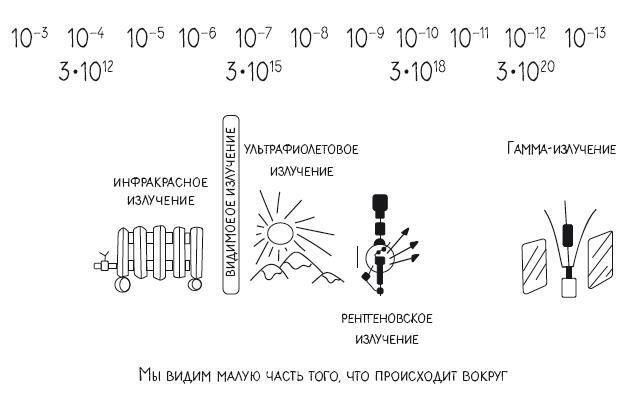 На рисунке есть тонкая полосочка – это видимое излучение. Мы видим очень малую часть того, что происходит вокруг. Многие другие живые существа видят гораздо больше нас. Например, орлы и пчёлы видят ультрафиолетовый спектр.