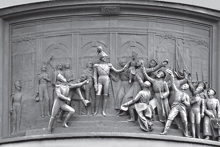 Император Николай I вверяет наследника попечению гвардейского караула 14 декабря 1825 г. Барельеф на памятнике работы П.К. Клодта