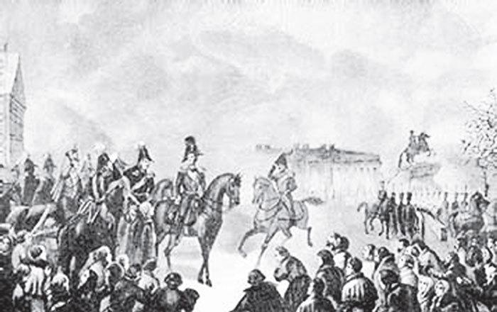 Началось долгое стояние. 14 декабря 1825 года на Сенатской площади рядом с обманутыми солдатами стояли не вожди Северного общества, не его многочисленные | Великий князь активные члены, а всего лишь несколько малозначительных фигур, молодые обер-офицеры и штатские. Диктатор восстания, штабной полковник князь С.П. Трубецкой, боевой офицер, участник наполеоновских войн, так и не появился на площади. Храбрость, неоднократно проявленная в боях, на сей раз ему изменила. Некоторое время он кружил, терзаясь переживаниями, вблизи площади, побывал в Главном штабе и присягнул императору Николаю, затем, уже в полном смятении, забрел в дом своей сестры, графини Потемкиной, где его вечером нашли лежащим в обмороке. Главный идейный руководитель, поэт и отставной артиллерийский подпоручик К.Ф. Рылеев, видя как на Сенатскую прибывают полки, верные государю, отправился искать Трубецкого, и больше не вернулся. Армейский полковник А.М. Булатов описывал по городу еще большие круги, чем Трубецкой, несколько раз приближался к императору, но так и не решился его убить, раздираемый противоречивыми мыслями, мучимый совестью, что вскоре после восстания привело его к самоубийству. Еще одна яркая фигура заговора, драгунский капитан А.И. Якубович, кавказский герой, дуэлянт и авантюрист, чей мрачный романтический облик и пламенные речи о цареубийстве вдохновляли молодежь, показывали готовность к решительным действиям, не стал поднимать войска на бунт, а повел жалкую двойную игру – повинился перед императором, отрекся перед ним от своих сообщников, и начал бегать между враждующими сторонами, прикидываясь своим для каждой из них.