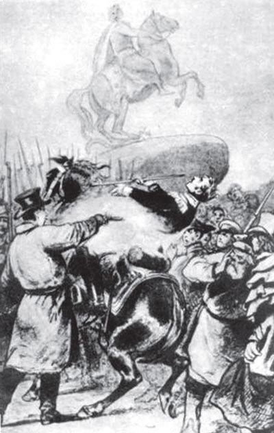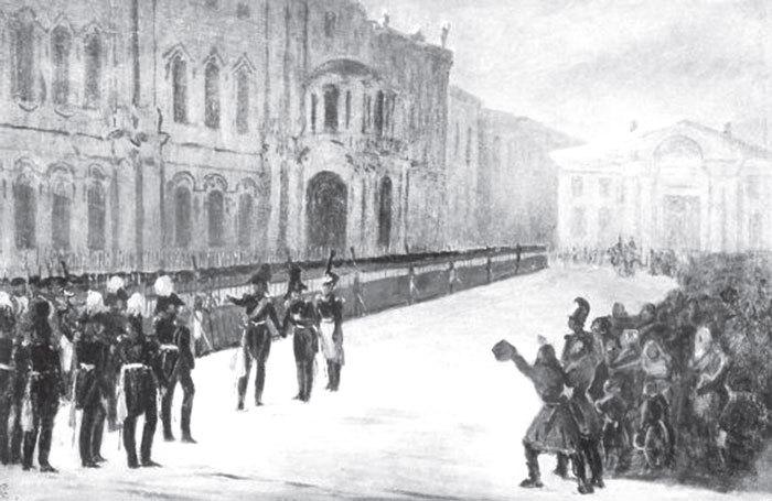 Подъехавший к восставшим петербургский генерал-губернатор, генерал от кавалерии М.А. Милорадович, герой многих войн, любимец А.В. Суворова и М.И. Кутузова, начал уговаривать солдат Московского полка прекратить бунт и присягнуть законному государю, стыдить их, перечисляя прежние сражения, напоминая о воинском долге и чести. Он пошел на этот отчаянный шаг, чтобы спасти и положение в столице, и свое положение при новом императоре, которого две недели назад не хотел пускать на трон. Зная авторитет генерала среди солдат, декабрист и отставной поручик П.Г. Каховский выстрелил в Милорадовича из пистолета, а его сообщник поручик князь Е.П. Оболенский нанес удар штыком. Генерал, который во многом явился виновником и междуцарствия, и самого восстания, погиб от рук тех, кого не пожелал вовремя остановить.