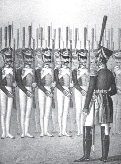 Хорошая строевая подготовка так же важна для армии, как и боевые навыки, особенно в войнах начала XIX века, где одно с другим неразрывно связано. В этих красивых и благородных войнах был свой порядок, своя тактика, совершенно не похожие на войны следующих веков. Ровные шеренги войск, четкое равнение рядов, мерное движение в ногу сплачивали солдат в бою, вселяли уверенность и твердость. Наступающие батальоны под огнем останавливались по команде для того, чтобы выровнять ряды. Даже при отступлении нужно было сохранять порядок, чтобы отойти непобежденными, несломленными. Когда в большом сражении рассеивался дым очередной схватки, и полководец с холма видел в трубу поредевшие, но сомкнувшиеся и ровно стоящие ряды своих солдат, он знал, что они выстояли и сохранили боеспособность. И напротив, расстроенные ряды, растерявшиеся боевые порядки, рассеянные толпы людей были несомненным признаком разгрома и поражения.