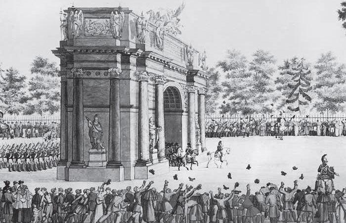 Вступление гвардии в Петербург через Нарвские ворота. Гравюра И.А. Иванова (фрагмент). 1814 г.