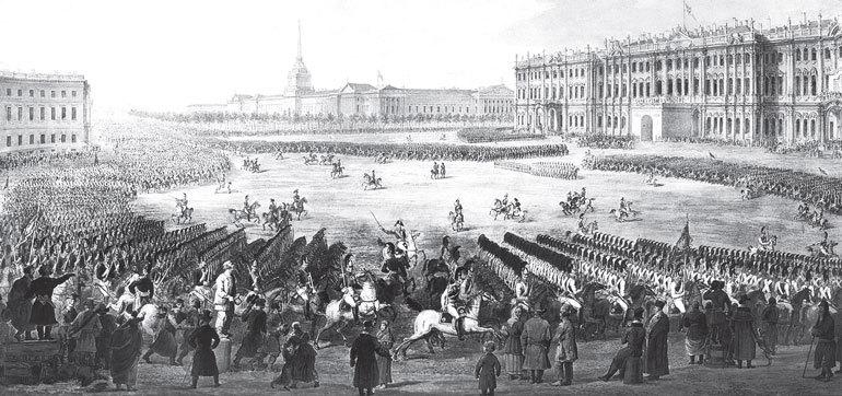 Петербург родился в ходе войны, много раз провожал своих солдат в поход, встречал с победой. Парады гвардии по торжественным дням, ежедневные разводы караулов, роты и батальоны, идущие на учения и с учений, выход гвардии в Красносельский лагерь и возвращение из него были непременной картиной петербургской жизни. Солдаты и офицеры составляли значительную часть населения столицы Российской империи.