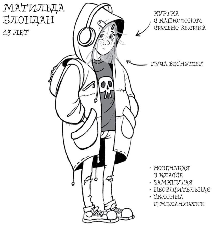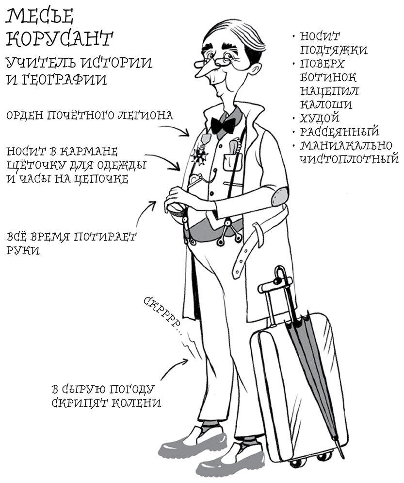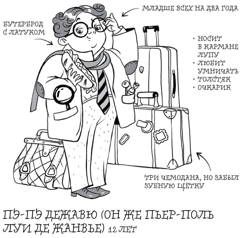 Но лучше я расскажу всё по порядку. Сегодня, 18 февраля, в 12:15 наш поезд выехал с Лионского вокзала, и мы покинули Париж. Мы – это Пьер-Поль де Жанвье, он же Пэ-Пэ Дежавю, на два года младше нас, но всё равно лучший ученик в классе[2], с тремя дорожными сумками, но без зубной щётки. Матильда Блондан, она же Матильда Блондан, в нашей школе новенькая, замкнутая и необщительная, поэтому никто пока не придумал ей прозвища, несмотря на веснушки и куртку с капюшоном, которая ей сильно велика. Ну и, наконец, месье Корусант, наш учитель истории и географии: он носит часы на цепочке, волосы всегда аккуратно расчёсаны, на пиджаке нагрудный кармашек, а в сырую погоду у него скрипят колени.