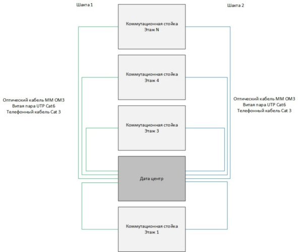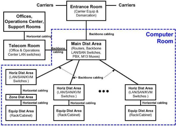 •Коммуникационные помещения (Telecommunication Room TR) — включающие в себя Main Distribution Area MDA и Horizontal Distribution Area HDA;