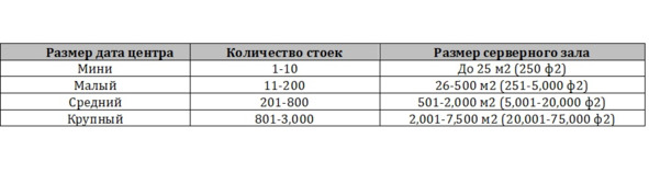По размерам ЦОДы можно разделить по площади машинного зала и ассоциируется с количеством вмещаемых стоек. Так для примера: