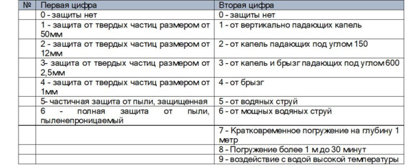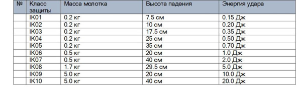 Первая таблица показывает уровень защиты устройства от пыли и влаги. Таблица антивандальной защиты, используется как правило для оборудования безопасности, таких как камеры, замки и ридеры, которые показывают защищенность от физического воздействия.
