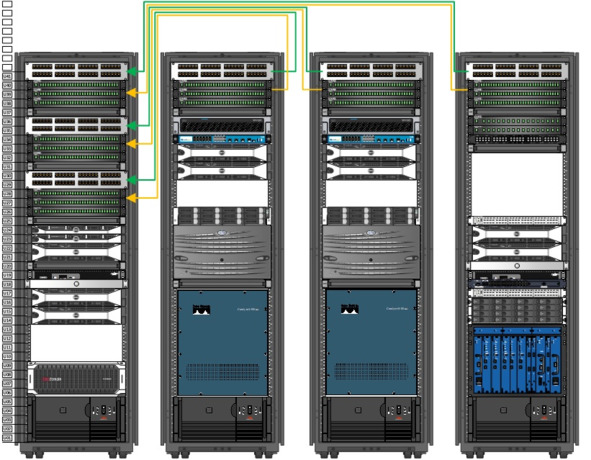 •Второй — два недорогих сплит кондиционера с мощностью порядка 18—24 кBTU каждый. В этом случае можно обойтись без фальшпола. Кроме этого желательно расположить кондиционеры друг против друга, а также выдвинуть стойки вперед и развернуть две из них в обратном направлении. Например, первая и третья стойки смотрят вперед, а вторая и четвертая задними дверками. Это обеспечить равномерность охлаждения комнаты и устранение мертвых зон теплого воздуха. Кроме этого не распологать кондиционеры над шкафами и электрощитами. Кодиционеры должны работать совмесно.