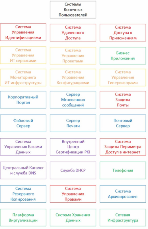 Системы обеспечения (Facility Infrastructure) — Не являются ИТ сервисами, ИТ не является владельцем или управляющим сервисов, но необходимы для функционирования ИТ инфраструктуры. Как правило их внедрение и сопровождение производится административным департаментом и департаментом безопасности организации.