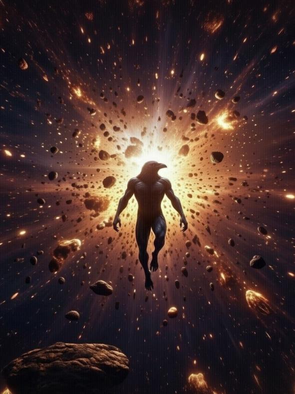 Существо корчилось в конвульсиях, впитывая энергию космоса. Его трансформация была отвратительна — тёмная материя формировало чёрное тело с головой ворона, но лишённое всякой красоты. Из недр метеорита поднялось создание, окутанное мраком, с очертаниями, напоминающими сущность с птичьей головой.