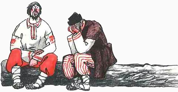 Вошёл Иван в избушку, а там двое мужиков на лавке сидят, плачут. Иван их сразу признал. Те самые, что из-за шапки-невидимки, скатёрки-хлебосолки и сапог-скороходов спорили. Присмотрелся — у одного ног нет, у другого глаз нет.