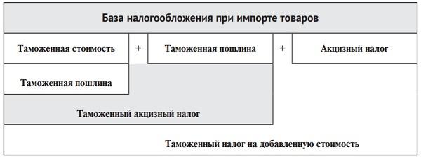 Нетрудно заметить, что при исполнении декларантом (или лицом, несущим с декларантом солидарную ответственность) обязанности по уплате таможенных платежей (таможенной пошлины, таможенного акцизного налога и таможенного налога на добавленную стоимость) имеет место «цепная реакция» повышения уровня налогооблагаемой базы, а именно: ввозимый на евразийскую единую таможенную территорию товара (объект налогообложения) облагается таможенными органами государств — членов Евразийского экономического союза последовательно несколькими налоговыми платежами: и ввозной таможенной пошлиной, и таможенным акцизным налогом, и таможенным налогом на добавленную стоимость (рис. 1.4).)