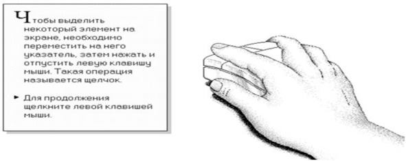 Щелчок или двойной щелчок по левой кнопке мышки (указательным пальцем) на объекте в виде пиктограммы, символа или пункта меню вызывает какое-либо действие, а щелчок по правой кнопке мышки (средним пальцем) показывает контекстное меню, т.е. список действий пользователя в этой конкретной ситуации.