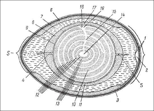 Рис. 1. Схема строения куриного яйца: 1 – подскорлупные оболочки; 2 – воздушная камера; 3 – скорлупа; 4, 5 – градички; 6 – наружный жидкий слой белка; 7 – средний плотный слой белка; 8 – средний жидкий слой белка; 9 – внутренний плотный слой белка; 10 – желток; 11 – желточная оболочка; 12 – слои желточного желтка; 13 – слои светлого желтка; 14 – латебра; 15 – шейкалатебры; 16 – ядро Пандера; 17 – желточная оболочка; 18 – зародышевый диск