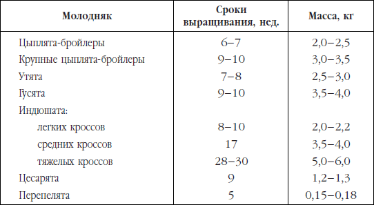 Таблица 1. Сроки выращивания и конечная живая масса молодняка сельскохозяйственной птицы
