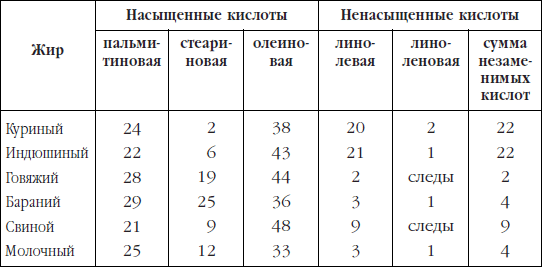 Таблица 3. Содержание жирных кислот в различных жирах (% от массы жира)