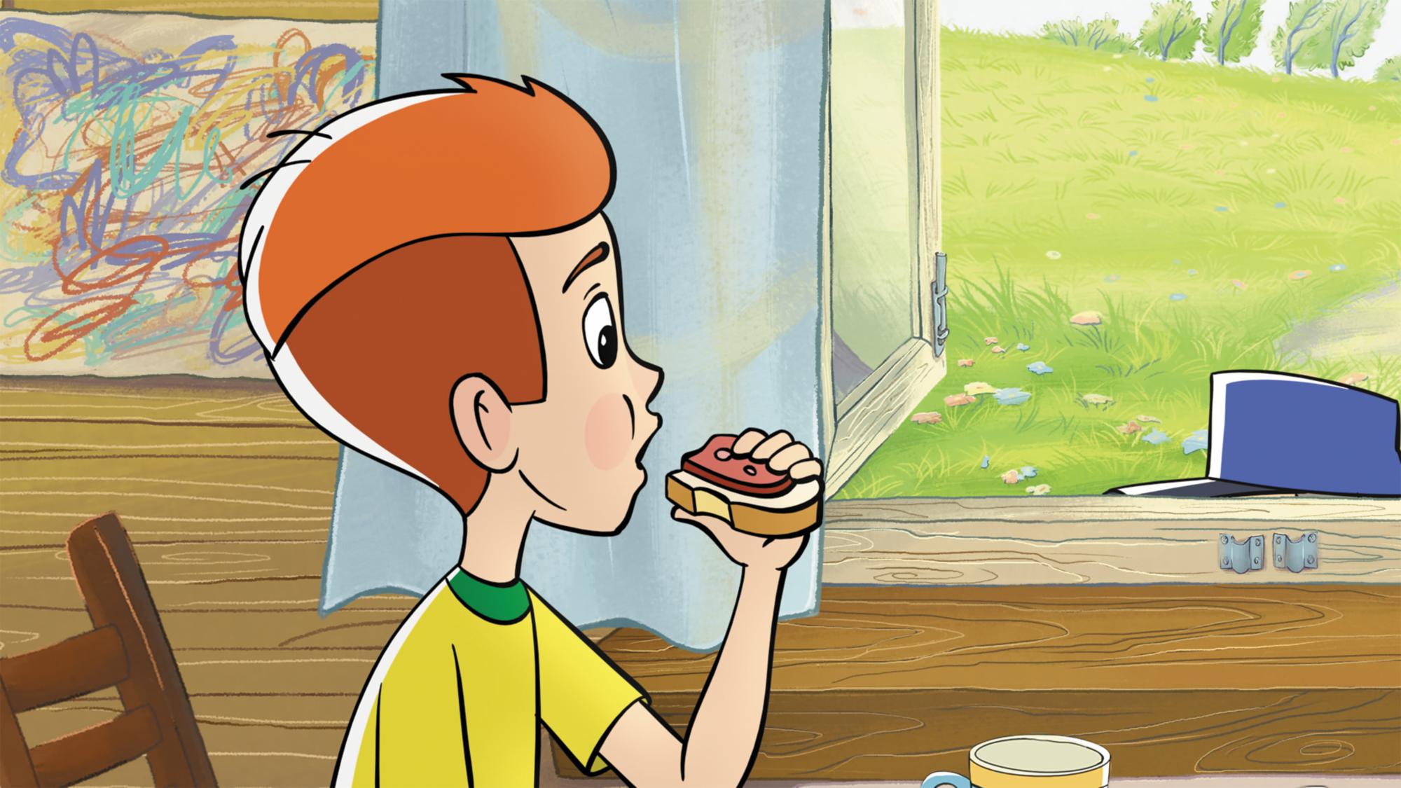 А за окном к дому какая-то синяя кепочка подкрадывается — как раз к той стороне стола, где тарелки с бутербродами и пирожками стоят.