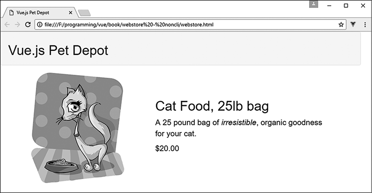 Первым делом мы заложим фундамент интернет-магазина, выведем его название и создадим описание отдельно взятого продукта. Мы сосредоточимся на создании Vue-приложения и отображении данных с помощью модели представления. Результат, который должны получиться к концу главы, показан на рис. 2.1.