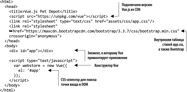 Какой бы способ применения вы ни выбрали, любое Vue-приложение содержит как минимум один экземпляр Vue. Самые простые программы ограничиваются единственным экземпляром, который связывает заданную разметку и данные, хранящиеся в модели представления (рис. 1.4).