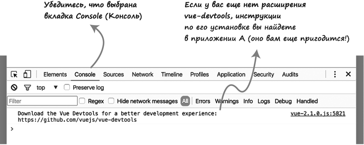 Перед тем как начать, следует загрузить расширение vue-devtools для вашего браузера. О том, как это сделать, можно узнать в приложении А.