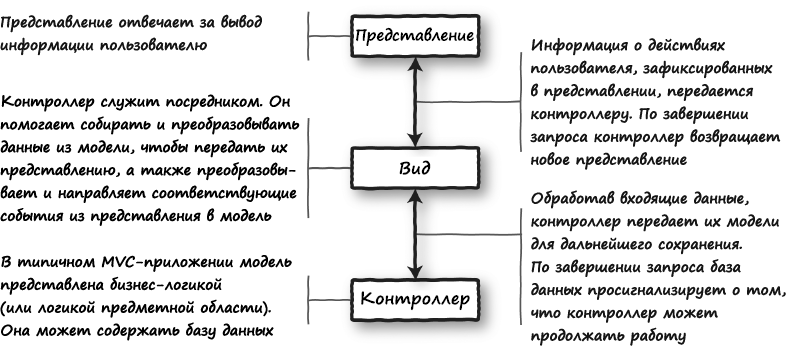 Если хотите узнать больше о шаблоне проектирования MVC, можете начать со статьи Мартина Фаулера (Martin Fowler), посвященной эволюции MVC: martinfowler.com/eaaDev/uiArchs.html.