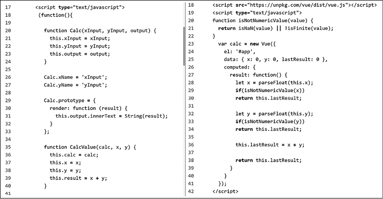 Рис. 1.3. Сравнение версий реактивного калькулятора, написанных на чистом JavaScript (слева) и Vue (справа)
