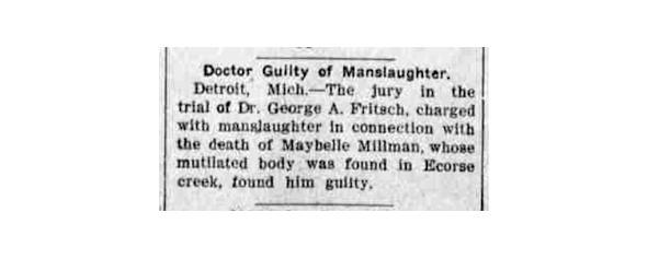 В марте следующего 1910 года состоялся суд. Фритч вполне ожидаемо отказался от дачи показаний, предоставив адвокатам говорить вместо себя. В связи с этим в деле остались невыясненные моменты, в частности, никто так и не узнал, что стало с одеждой и личными вещами Мэйбелл Миллман. Понятно было, что доктор избавился от них, но где и как он это сделал, никто так и не узнал. История с неудачным абортом и последующим расчленением умершей женщины, как и последующее поведение доктора, производили совершенно омерзительное впечатление, в Детройте в те дни, наверное, не нашлось бы ни одного человека, сочувствовавшего обвиняемому.