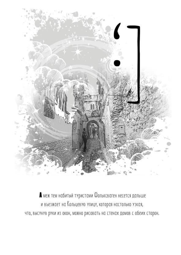 А меж тем набитый туристами Фольксваген несется дальше и въезжает на Кольцевую улицу, которая настолько узкая, что, высунув руки из окон, можно рисовать на стенах домов с обеих сторон. Время от времени туристы так и поступают, поэтому Кольцевая — самая любопытная из тех улиц города, на которых круглые сутки могут появляться посторонние. Некоторые же, особенно выдающиеся уголки, Город показывает лишь тем избранным, которых успел полюбить. Он тоже хочет понравиться, запомниться. Вот и ведет себя иногда, как юная кокетка.