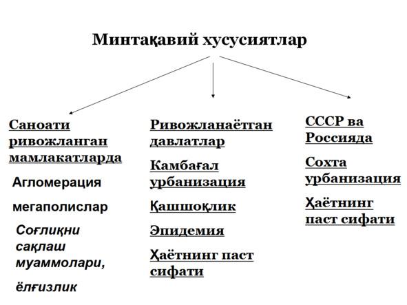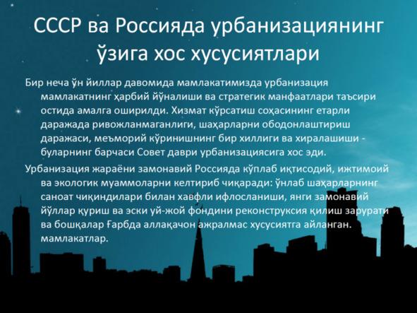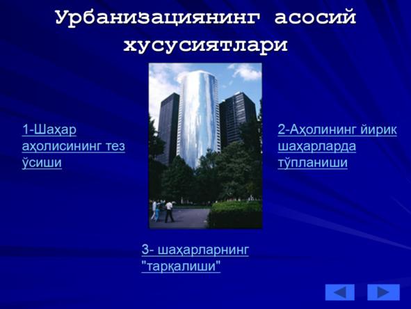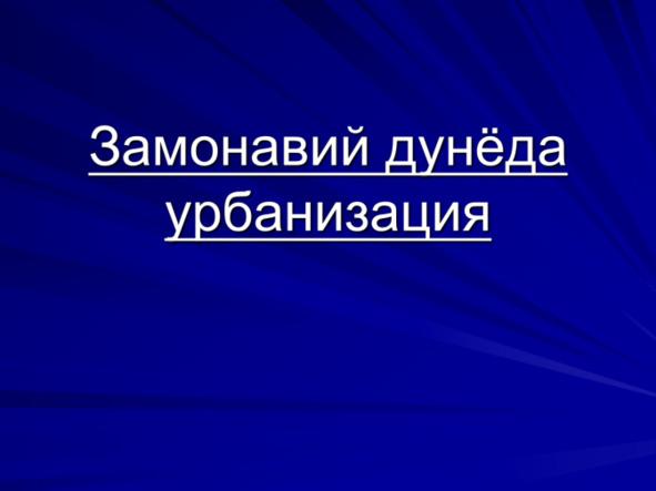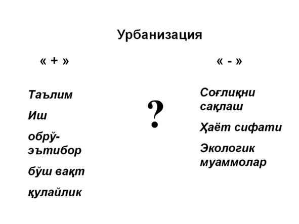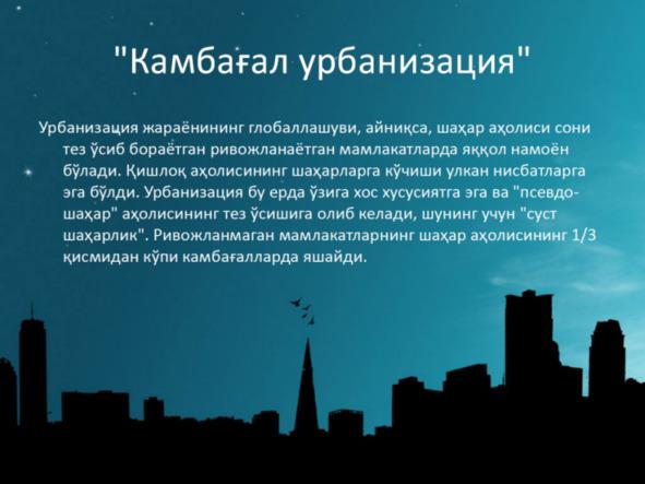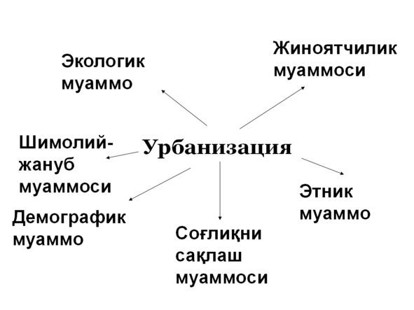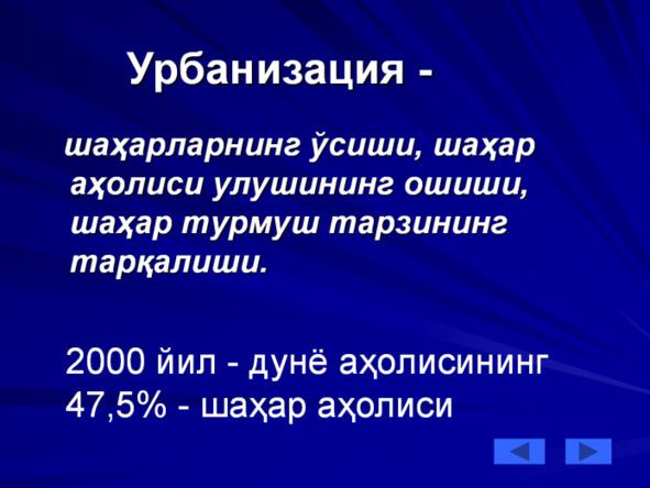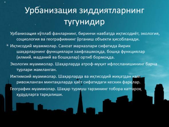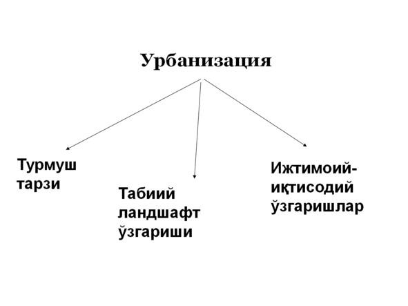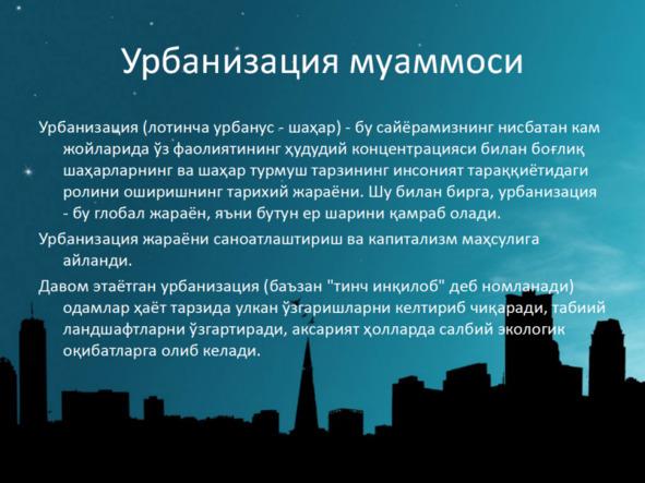 Урбанизация бу нафақат шаҳарларнинг кескин кўтарилиши ва ривожланиши, шаҳар аҳолиси улушининг ошиши, балки шаҳарларнинг жамият хаётининг барча соҳаларидаги ўрни ва аҳамиятининг ошиши ҳамда шаҳар йўлининг устунлиги ҳисобланади.