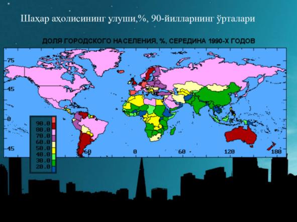 Сўнгги пайтларда иқтисодий жиҳатдан ривожланган мамлакатларда шаҳар аҳолисининг улуши аллақачон аҳолининг 75—80 фоизини ташкил қилмоқда ва бу кўрсатгич ўша даражада сақланиб қолмоқда, бу ривожланиётган мамлакатлар ҳақида гапириш мумкин эмас, чунки у ерда шаҳар аҳолисининг улуши анча паст.
